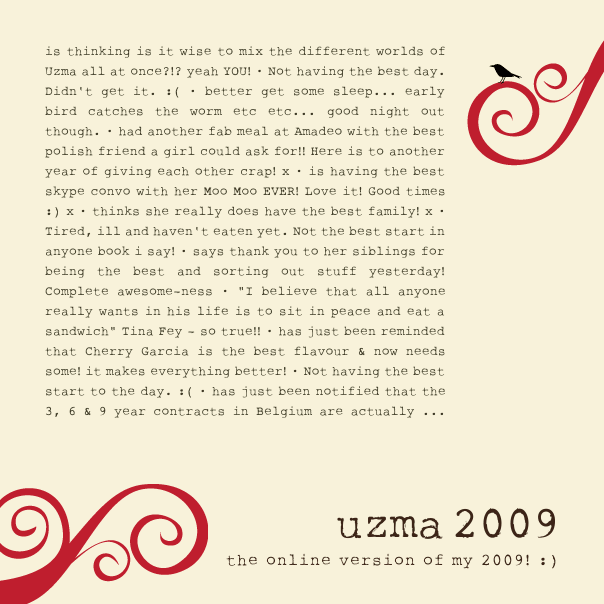 But at the end of the year, this is an interesting app where they put together a mix of your facebook statuses from 2009 and put it in a fancy background. I did it, as I was bored and I am spending another evening snowed in with my lovely family who are also computer addicts so itโs a very quiet household right now ๐ (I need to justify the actions of using facebook apps somehow!)